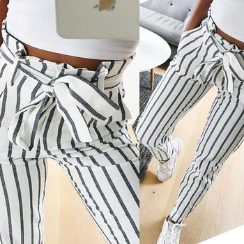 2018 fashion autumn women casual mid waist pants white striped bow tie drawstring sweet elastic waist pockets casual trousers