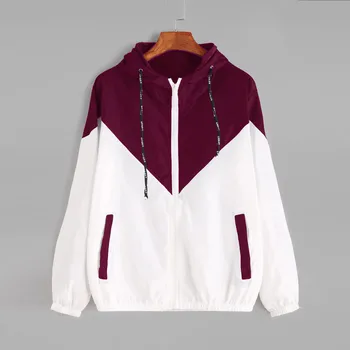 FeiTong Tone splice women jacket casual Hooded Autumn zipper windbreaker jacket Pockets long sleeves coat women’s clothing