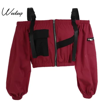Weekeep Women Fashion Slash Neck Patchwork Jackets Spring Autumn Adjustable Strap Front Zipper Cropped Streetwear Jacket Tops
