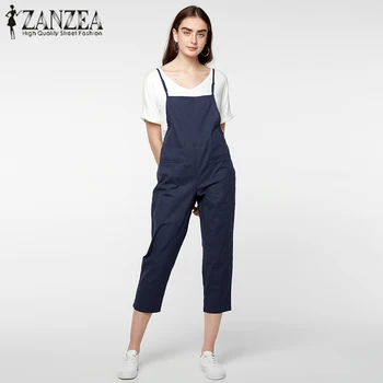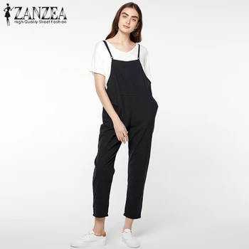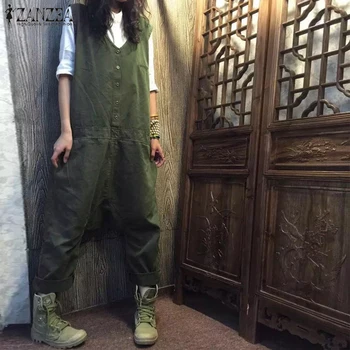 Fashion ZANZEA Women Rompers Sleeveless Solid Casual Loose Harem Cargo Pants Summer Drop Crotch Cotton Linen Overalls Jumpsuits