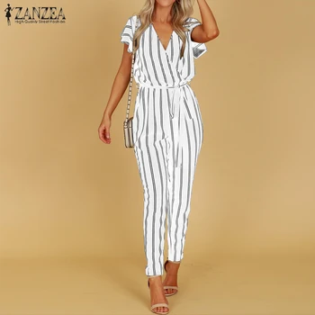 ZANZEA 2018 Striped Jumpsuit Women Hight Waist Casual Trousers Ladies Sexy V Neck Belted Bodysuit Workwear Overall Plus Size 5XL