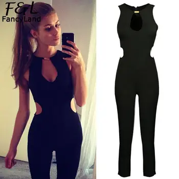 Alishebuy Rompers Womens Jumpsuit 2018 Hollow Out High Waist Cut Out Pockets Back Zipper Sleeveless O Neck Solid Slim Jumpsuits