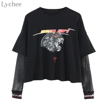 Lychee Harajuku Punk Women T Shirt Mesh Hollow Out Patchwork Letter Leopard Print Casual Long Sleeve T-shirt Tee Top