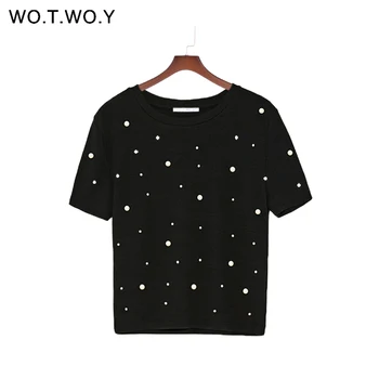 WOTWOY Summer Pearls Beaded T-Shirt Women Cotton Loose Casual Black Tops Women Short Sleeve O-Neck Tee Shirt High Quality 2018