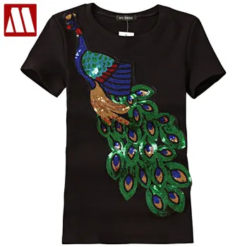 2018 Noble Elegant T shirt Women Peacock Sequined Sequins T-shirt Womens Fashion New Top Tee Shirt Femmer Lady Sakura Clothes